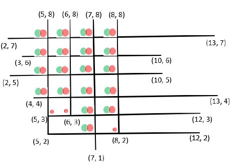 台灣科研火箭終於成功升空,如果他們想用機器人到月球開發棋盤式街道(縱橫交錯),由於降落點無法精準定位,為了節省燃料,所以從降落點開始隨機開闢南北向或東西向街道,機器人燃料即將用完時,就停止開發,如下圖【按我看圖】之街道(一條線即代表一條街道),起點終點分別用(x,y)座標點表示,x,y 均為整數,0≤ x,y ≤ 99999 街道交叉處的十字路口需設置 2 組紅綠燈(南北向 1 組,東西向 1 組),丁字路口只需設置 1 組紅綠燈,(90 度)轉折的道路不需設置紅綠燈,請您幫忙決定,到底需設置多少組紅綠燈?